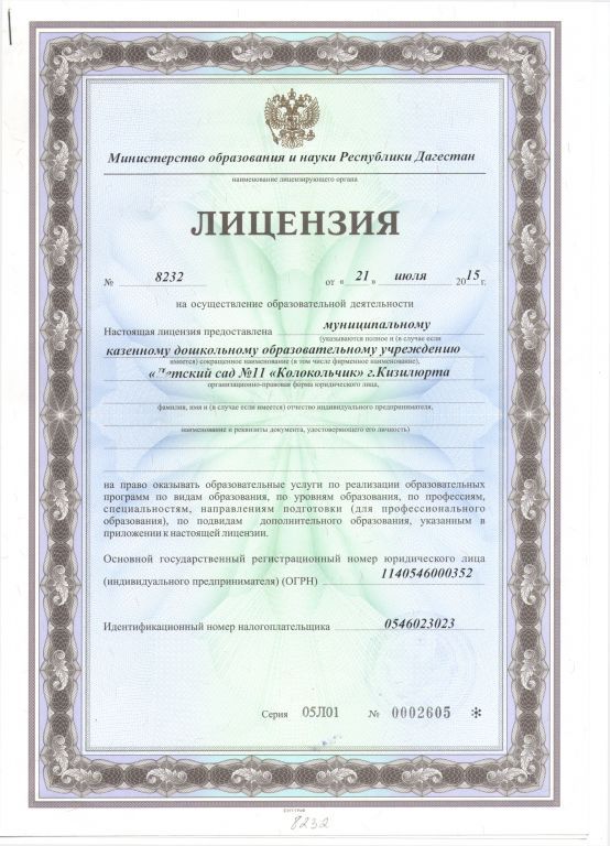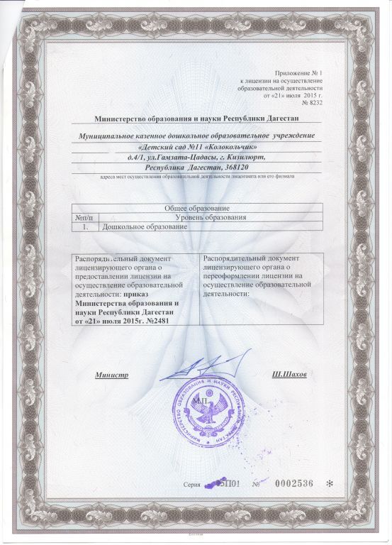 | Полное наименование образовательной организации* | Муниципальное казенное дошкольное образовательное учреждение «Детский сад №11 «Колокольчик» |